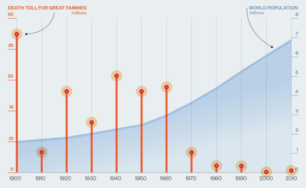 Not only has humanity not been wiped out by starvation, the death toll from famines has dropped to near zero. Source