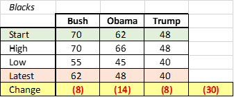 The decline has continued during Trump’s presidency … going from 48% favorable among blacks to only 40% most recently (a drop of 8 percentage points).