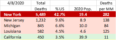 Note: First case in metro NYC was a traveler from Wuhan. Conjecture is that Detroit outbreak was spawned by Wuhan connections to auto manufacturers and that New Orleans was seeded during Mardi Gras – an international “institution”. Governors in RI and FL have attempted shield their residents from New Yorkers, considered to have a higher rate of infection.