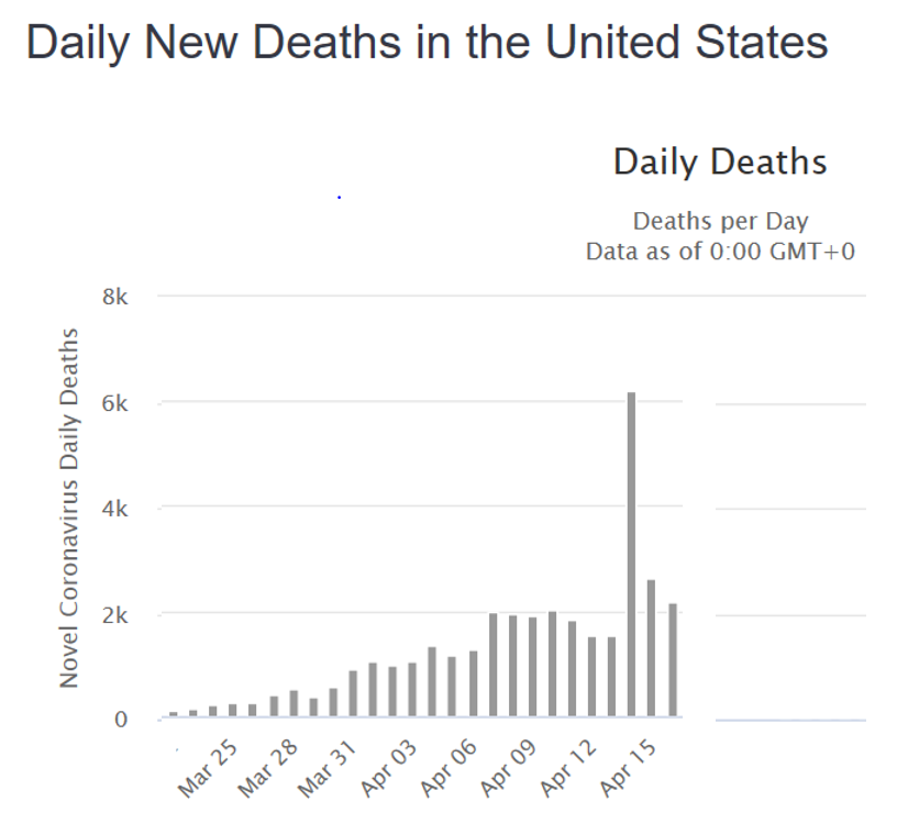 In essence, Worldometer analysts decided to book NY’s 3,700 newfound deaths on April 14 and restart their data series. Here’s their daily chart: