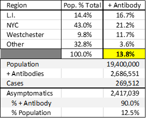 So, given that NY has had about 250,000 confirmed cases (which required severe symptoms), we would expect that the total number of people already infected in New York is 1.67 million (250,000 confirmed cases divided by 15%) … which is 8.6% of the NY population (1.67 divided by 19.5).