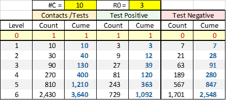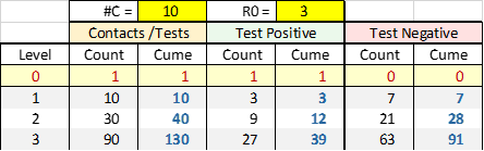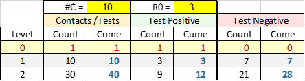 We’re assuming that those 10 are the “right” population of contacts for our initial infectee, so with R0 =3, 3 of the 10 are likely to test positive … and 7 are likely to test negative.