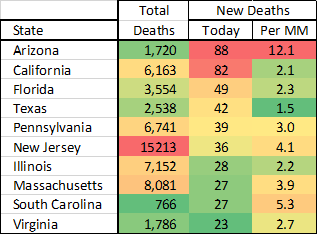 Confirmed cases have spiked upwards, mostly in Southern & Western states. The majority of the uptick is in the under 45 age group.  Some of the under 45s require hospitalization, but relatively few die (compared to the elderly death rate).