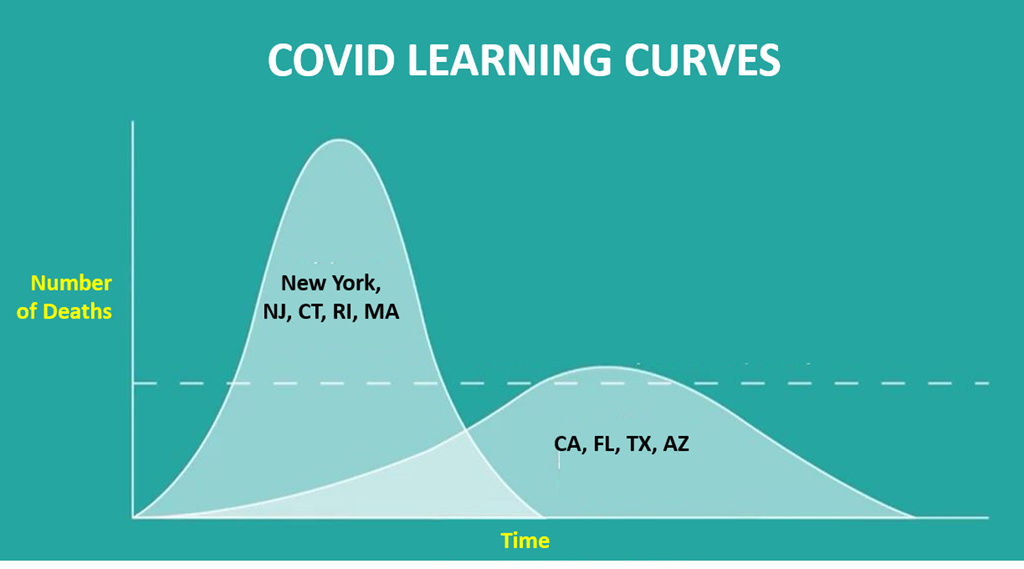 These later virus-developing states are testing more and, thus, counting more mild COVID cases … and, more importantly, benefiting from the learning in the early developing states.