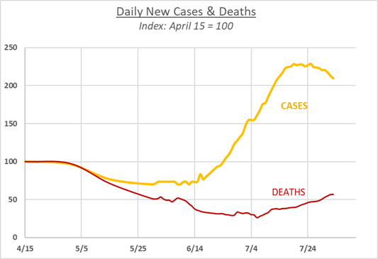 Putting those numbers into context, the daily case counts have more than doubled since the prior peak in mid-April … while daily deaths have hovered around 50% of their mid-April level.