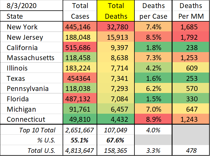 As logically to be expected, several big states have the highest death tallies … a function of their death rates and their population.