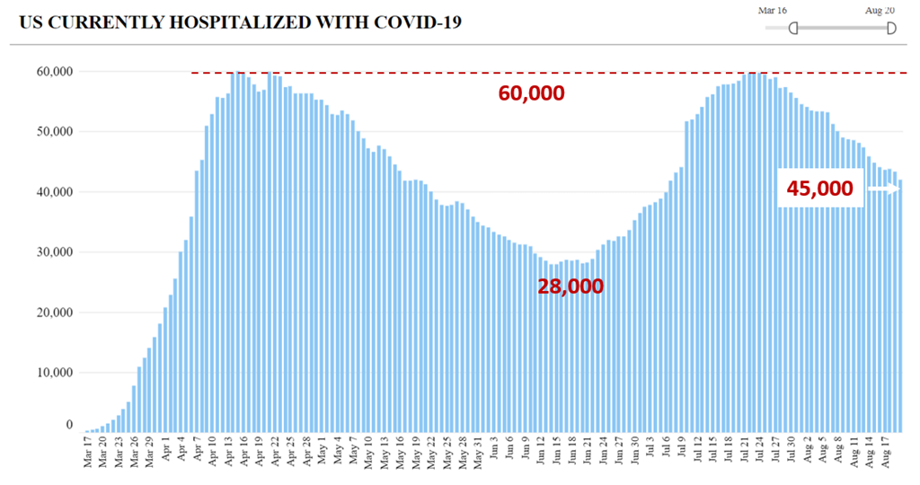 In fact, the number of covid-related hospitalizations has fallen by about 25% in the past month … and, at the current rate of decline, will be down to the prior covid-period low point sometime in mid-September.