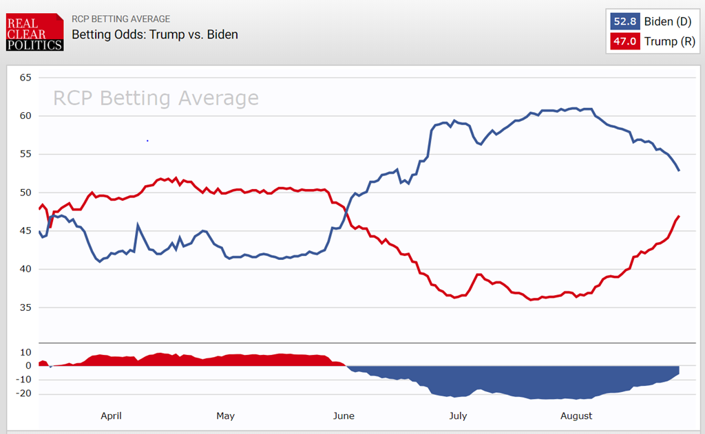 At the end of July, the RCP Betting Odds had Biden up 24 over Trump — 61 to 37.