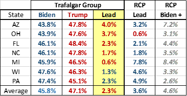 In the 7 swing states, Trafalgar has Trump leading by 2.3%.