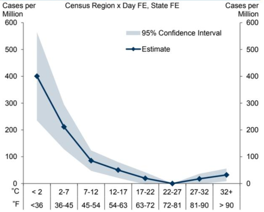 A team of researchers at Goldman Sachs turned on their regression machines and found a compelling relationship between outside temperature and CODID case confirmations.