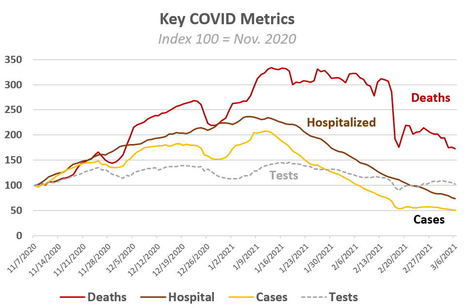Note: At the index starting date: deaths were ~1,000 per day. hospitalizations were ~55K, cases were ~ 100K and tests were ~1.4 MM per day