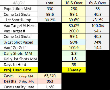 This entry was posted on April 2, 2021 at 6:00 am and is filed under COVID - Return to Normalcy, COVID - vaccine, COVID-19 Tracking, COVID-Herd Immunity. You can follow any responses to this entry through the RSS 2.0 feed. You can leave a response, or trackback from your own site.