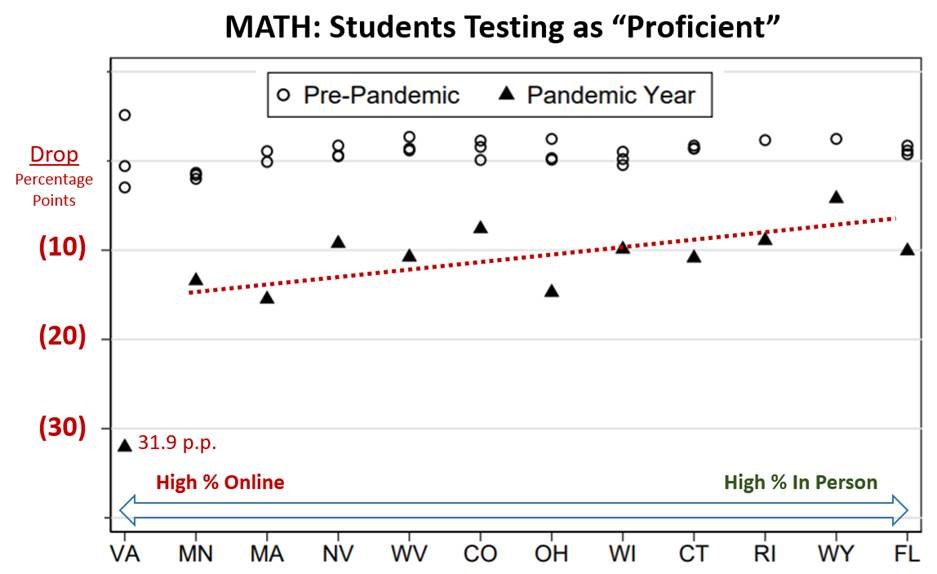 > Note that the state that scored highest in proficiency in 2019 (VA @ 76.1%) kept its lead in 2021 (67.1%) despite having the biggest drop (down 9 percentage points). The researchers point out that, of the 12 states studied, Virginia offered the least amount of in-person instruction during the pandemic.