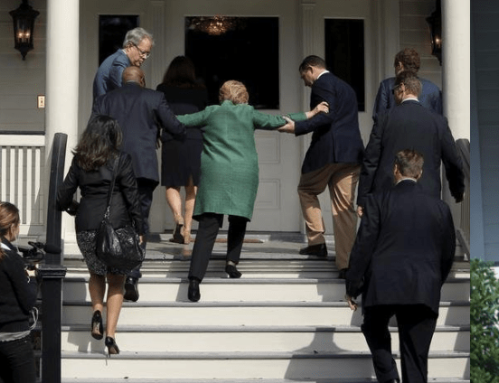 In this 2016 picture, a frail –looking Hillary Clinton – who has a history of injuries from falls (including at least one concussion) – hobbles up a flight of stairs with the assistance of Secret Service agents and aids.