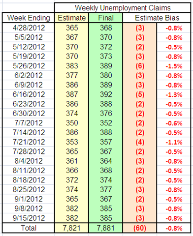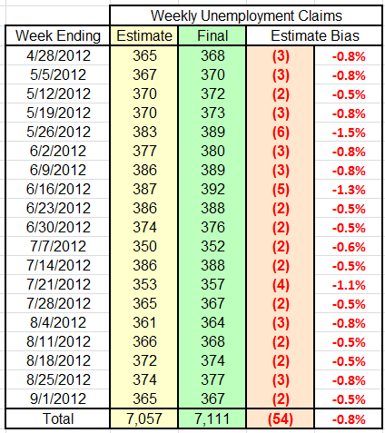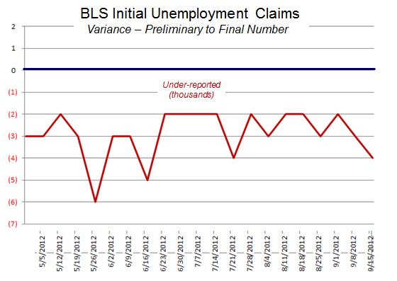For example, in the week ending September 22, the preliminary number (367,000) was compared to September 15th’s revised number (363,000) and and 4,000 drop in unemployment claims was reported. The September 15 preliminary number – the basis for the September 15 report — was 359,000. So, comparing preliminary estimates for the two weeks, unemployment claims increased by 8,000 not 4,000. And, based on the past 22 weeks of initial underreporting, that number is likely to swell when the September 22 number is revised – most certainly upwards.