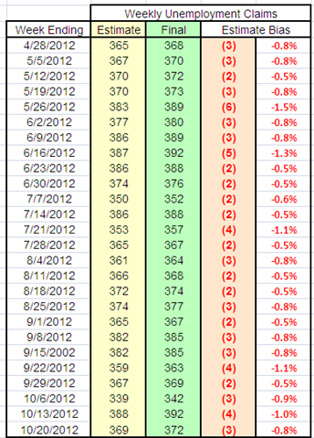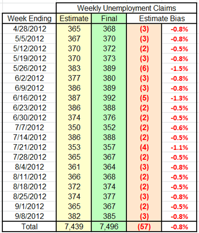Because each week’s “headline” number of changes in unemployment claims is derived by taking the current week’s preliminary number and comparing it to the prior week’s revised number.
