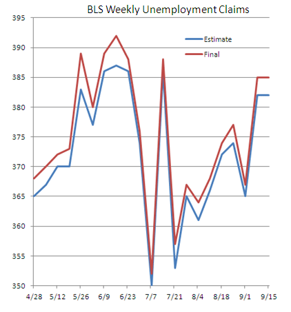 Based on Thursday’s BLS report, the number for the week ending Sept. 8 was revised upward from 382,000 to 385,000.