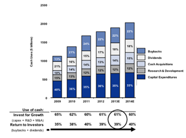 While left-leaning pundits think that the cash balances to hire more employees — a seriously flawed economic thought — historically, companies have applied available cash to: