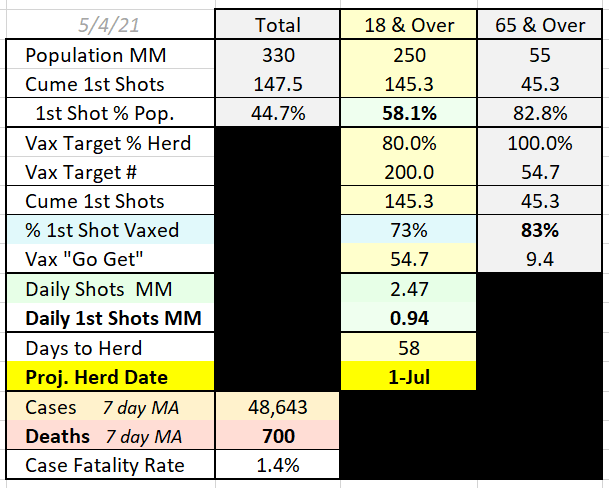 So, at full vaccine effectiveness (90%), we have 83.25 million UVEs (67.5 + 17.5 equals 83.25) … that’s about 37% of the over 18 adult population.