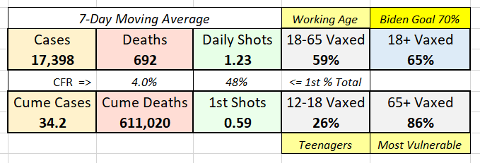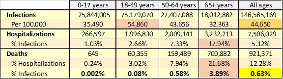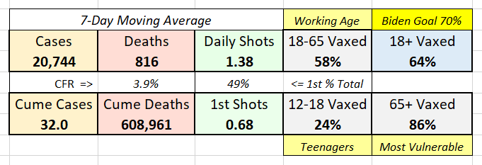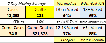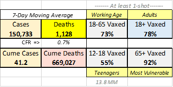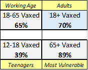 That would raise the number of UVEs (unvaccinated equivalents) up to 146.25 million (equal to 65% of 18 and over adults) … the 146.25 million is made up of 67.5 million unvaccinateds and 78.5 million vaccinateds whose vaccine effectiveness has waned (225 times 70% times 50%).