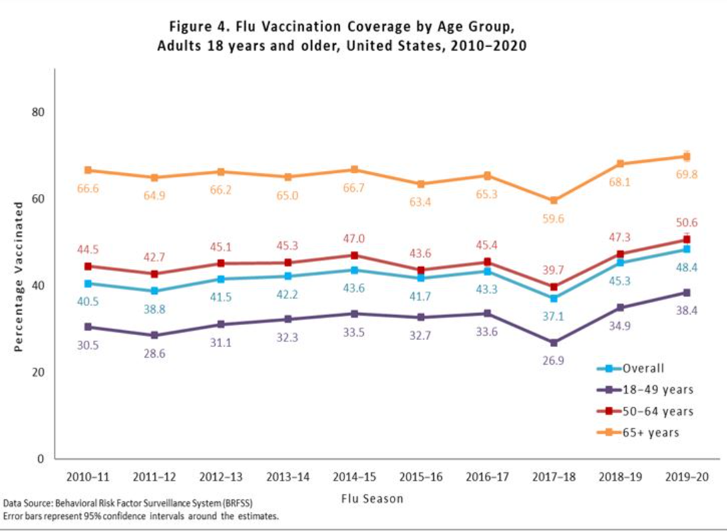 Note that only about 1/3 of adults 18 to 49 get flu shots … and it’s likely that the take-up rate is lowest among the younger adults in the 18 to 49 bracket?