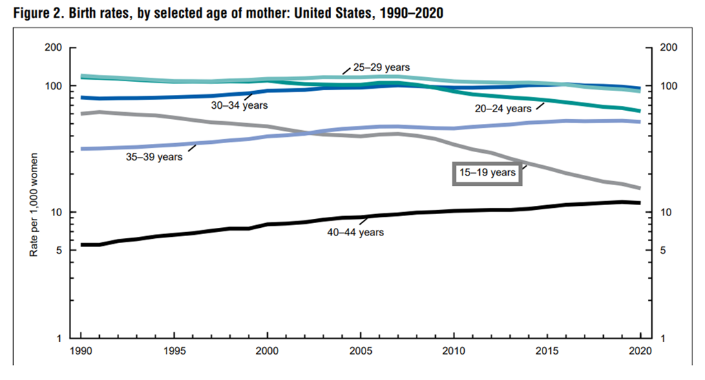 > Birth rate among teenagers continued its steep decline: In 2020 the birth rate for females aged 15–19 was 15.4 births per 1,000 …down 8% from 2019 ….and another record low