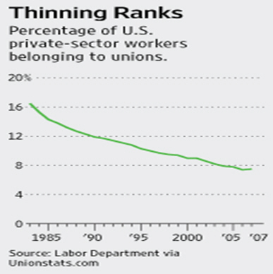 Unions consider the Employee Free Choice Act as vital to the survival of the labor movement, which currently represents 7.5% of private-sector workers, half the percentage it did 25 years ago. (see chart below)