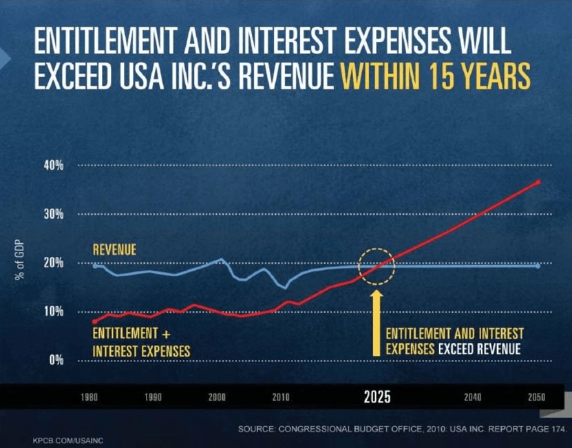 Here’s the predictable outcome … no budget left for ANYTHING except entitlements and interest on the debt … and, it can’t be solved by simply taxing the millionaires and billionaires who make more than $250,000..