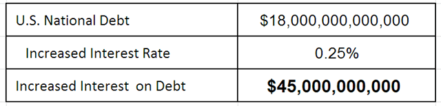 In yesterday’s post, I put the number in context, illustrating that the economic cost of a measly .25%  just on servicing the national debt is about $45 billion ( .25% times $18 trillion) ….  equivalent to roughly half of the Federal government’s annual cost for ObamaCare.