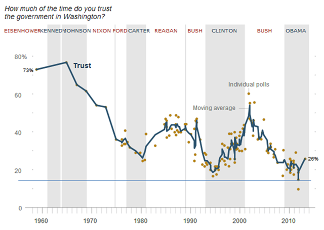 > The usual partisan divide is evident: 80% of Republicans think the gov’t is doing too many things; 78% of Dems think that the government is doing too little.