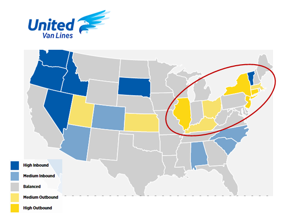 Illinois and New Jersey lead the pack with with 63% outbound, followed by New York (61%), Connecticut (57%) and Massachusetts (56%).