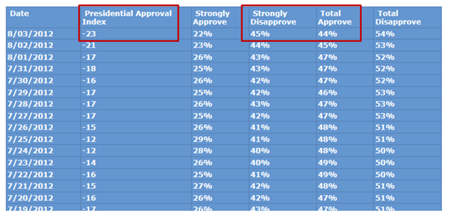 According to Gallup, Obama now has a 49% approval rating … down a couple of points from his election draw.