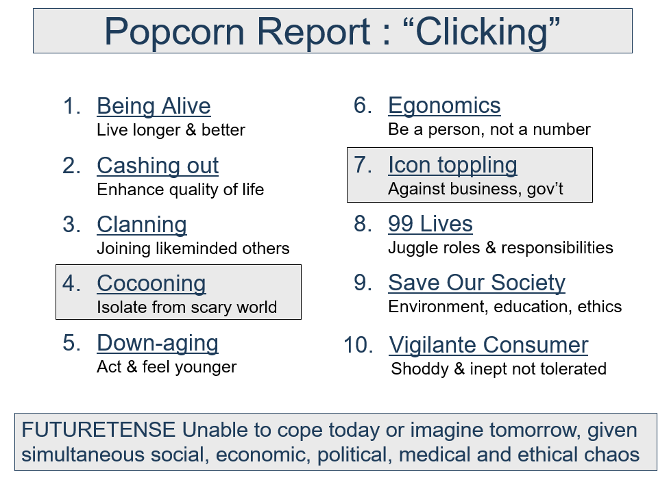 In a couple of best-selling books (The Popcorn Report, Clicking), Popcorn zeroed in on the major trends that she thought marketers needed to consider.