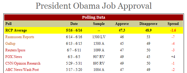 According to RCP, right-leaning Fox has Obama 6 points under water.